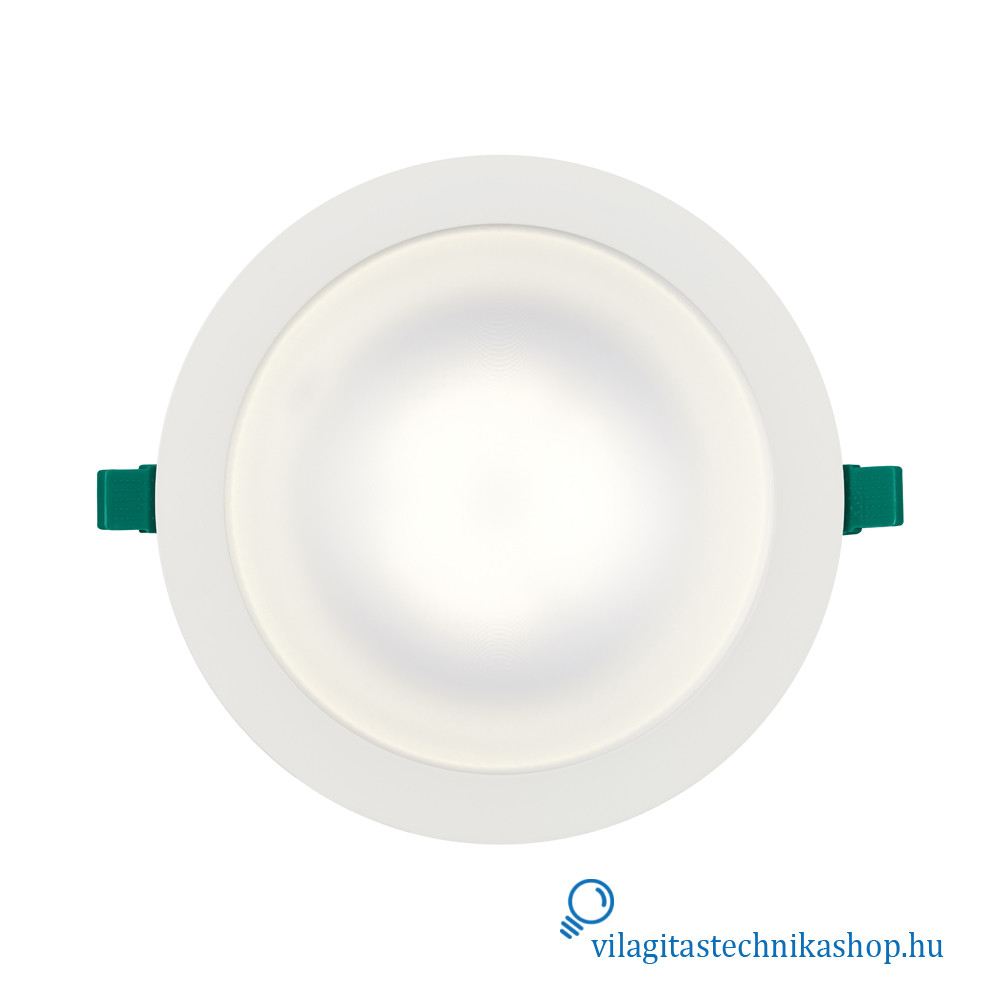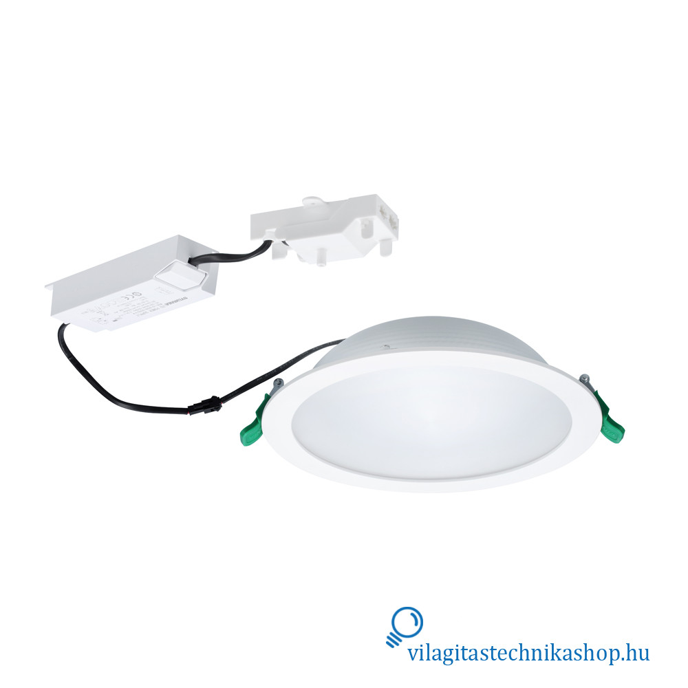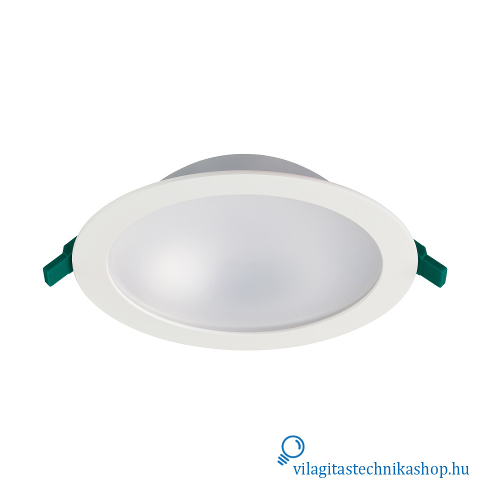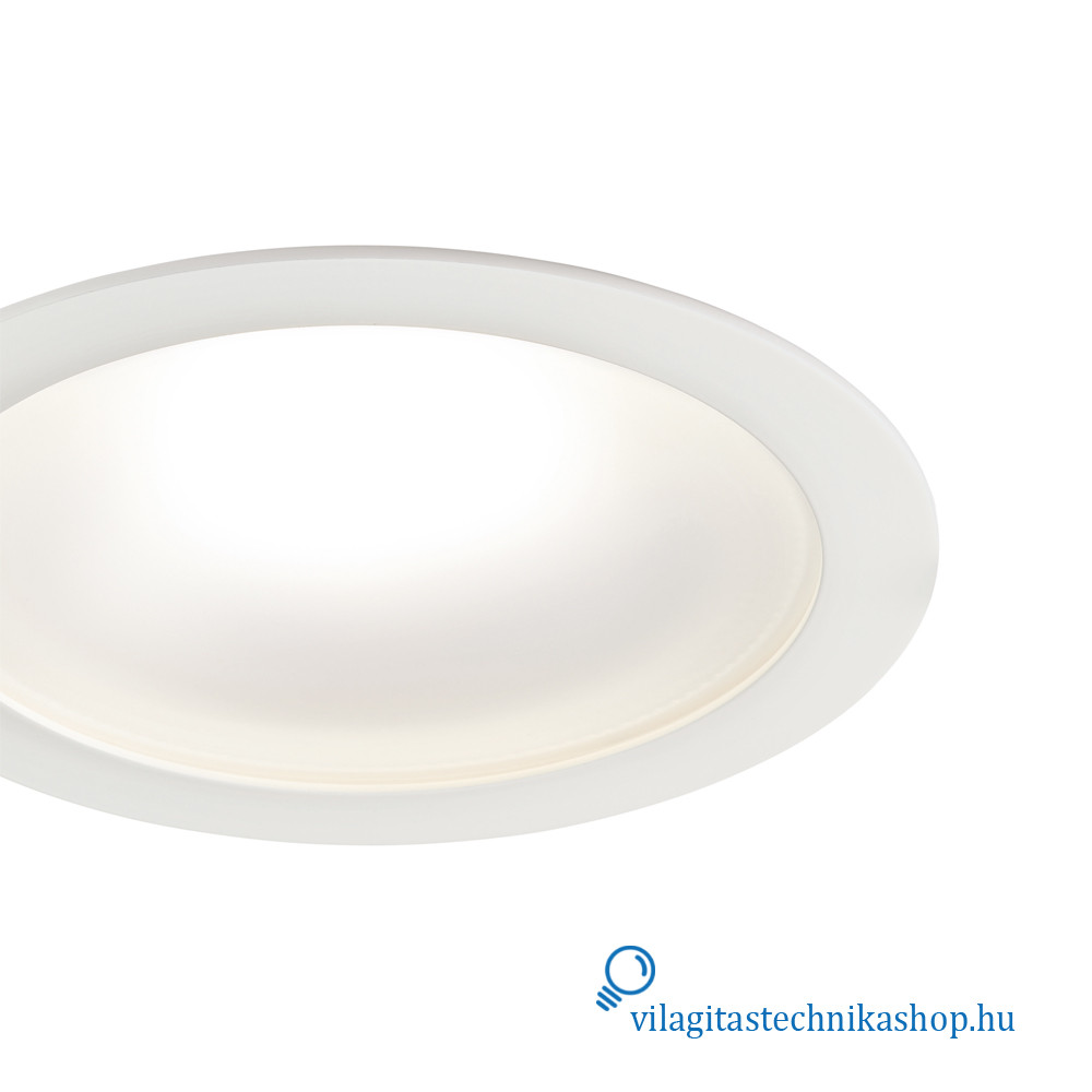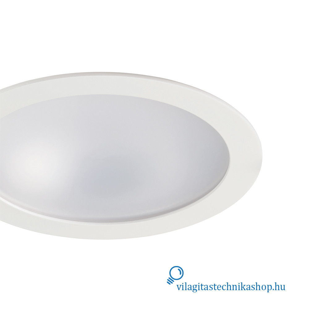 Süllyesztett mennyezeti LED downlight, IP54 védettséggel elölről nézve, ideális olyan helyekre, ahol korlátozott mennyezeti beépítési mélység áll rendelkezésre, hiszen a termék mélysége mindössze 60 mm, kivágási mérete pedig 205 mm. Kiváló alternatívája az 1x42 W-os kompakt fénycsöves downlightoknak.